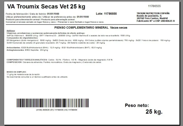 - Vitaminas Liposolubles (vit A, vit D3, Vit E). Igual que en el corrector de producción, las vitaminas A, D3 y E respetan las proporciones entre las vitaminas liposolubles para asegurar una óptima absorción de ellas (vitamina A, D3, y E) evitándose competencias entre ellas. Se consigue un buen estatus antioxidante que potencia la inmunidad en un momento crítico para la vaca de leche.